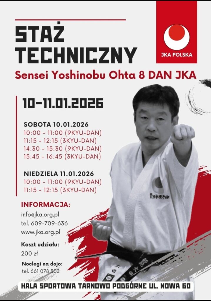 W imieniu Polskiej Federacji Japońskiego Karate mam przyjemność zaprosić Państwa na staż z wybitnym instruktorem JKA Karate – Ohta sensei (8 dan). Wydarzenie odbędzie się 10–11 stycznia 2026 r. w Tarnowie Podgórnym.