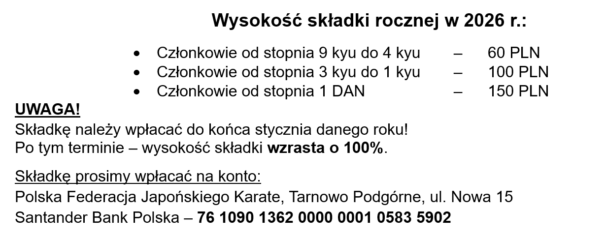 - Członkowie od stopnia 9 kyu do 4 kyu – 60 PLN